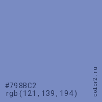 Цвет #798BC2 в цветовой модели RGB обозначается тремя октетами (121, 139, 194) в десятичном формате и #798BC2 в шестнадцатиричном (hex) формате, которые являются интенсивностью красного 121 (hex 79), интенсивность зелёного 139 (hex 8B) и интенсивность синего 194 (hex C2).