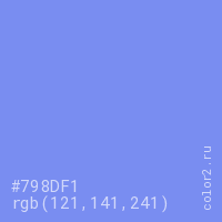 Цвет #798DF1 в цветовой модели RGB обозначается тремя октетами (121, 141, 241) в десятичном формате и #798DF1 в шестнадцатиричном (hex) формате, которые являются интенсивностью красного 121 (hex 79), интенсивность зелёного 141 (hex 8D) и интенсивность синего 241 (hex F1).