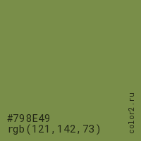 Цвет #798E49 в цветовой модели RGB обозначается тремя октетами (121, 142, 73) в десятичном формате и #798E49 в шестнадцатиричном (hex) формате, которые являются интенсивностью красного 121 (hex 79), интенсивность зелёного 142 (hex 8E) и интенсивность синего 73 (hex 49).
