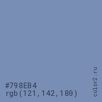 Цвет #798EB4 в цветовой модели RGB обозначается тремя октетами (121, 142, 180) в десятичном формате и #798EB4 в шестнадцатиричном (hex) формате, которые являются интенсивностью красного 121 (hex 79), интенсивность зелёного 142 (hex 8E) и интенсивность синего 180 (hex B4).