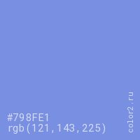 Цвет #798FE1 в цветовой модели RGB обозначается тремя октетами (121, 143, 225) в десятичном формате и #798FE1 в шестнадцатиричном (hex) формате, которые являются интенсивностью красного 121 (hex 79), интенсивность зелёного 143 (hex 8F) и интенсивность синего 225 (hex E1).