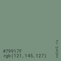 Цвет #79917F в цветовой модели RGB обозначается тремя октетами (121, 145, 127) в десятичном формате и #79917F в шестнадцатиричном (hex) формате, которые являются интенсивностью красного 121 (hex 79), интенсивность зелёного 145 (hex 91) и интенсивность синего 127 (hex 7F).