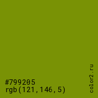 Цвет #799205 в цветовой модели RGB обозначается тремя октетами (121, 146, 5) в десятичном формате и #799205 в шестнадцатиричном (hex) формате, которые являются интенсивностью красного 121 (hex 79), интенсивность зелёного 146 (hex 92) и интенсивность синего 5 (hex 05).