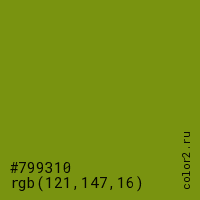 Цвет #799310 в цветовой модели RGB обозначается тремя октетами (121, 147, 16) в десятичном формате и #799310 в шестнадцатиричном (hex) формате, которые являются интенсивностью красного 121 (hex 79), интенсивность зелёного 147 (hex 93) и интенсивность синего 16 (hex 10).