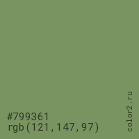 Цвет #799361 в цветовой модели RGB обозначается тремя октетами (121, 147, 97) в десятичном формате и #799361 в шестнадцатиричном (hex) формате, которые являются интенсивностью красного 121 (hex 79), интенсивность зелёного 147 (hex 93) и интенсивность синего 97 (hex 61).
