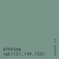 Цвет #79958A в цветовой модели RGB обозначается тремя октетами (121, 149, 138) в десятичном формате и #79958A в шестнадцатиричном (hex) формате, которые являются интенсивностью красного 121 (hex 79), интенсивность зелёного 149 (hex 95) и интенсивность синего 138 (hex 8A).
