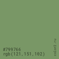Цвет #799766 в цветовой модели RGB обозначается тремя октетами (121, 151, 102) в десятичном формате и #799766 в шестнадцатиричном (hex) формате, которые являются интенсивностью красного 121 (hex 79), интенсивность зелёного 151 (hex 97) и интенсивность синего 102 (hex 66).