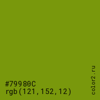 Цвет #79980C в цветовой модели RGB обозначается тремя октетами (121, 152, 12) в десятичном формате и #79980C в шестнадцатиричном (hex) формате, которые являются интенсивностью красного 121 (hex 79), интенсивность зелёного 152 (hex 98) и интенсивность синего 12 (hex 0C).