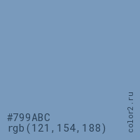 Цвет #799ABC в цветовой модели RGB обозначается тремя октетами (121, 154, 188) в десятичном формате и #799ABC в шестнадцатиричном (hex) формате, которые являются интенсивностью красного 121 (hex 79), интенсивность зелёного 154 (hex 9A) и интенсивность синего 188 (hex BC).