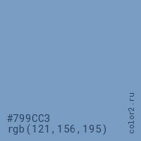 Цвет #799CC3 в цветовой модели RGB обозначается тремя октетами (121, 156, 195) в десятичном формате и #799CC3 в шестнадцатиричном (hex) формате, которые являются интенсивностью красного 121 (hex 79), интенсивность зелёного 156 (hex 9C) и интенсивность синего 195 (hex C3).