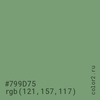 Цвет #799D75 в цветовой модели RGB обозначается тремя октетами (121, 157, 117) в десятичном формате и #799D75 в шестнадцатиричном (hex) формате, которые являются интенсивностью красного 121 (hex 79), интенсивность зелёного 157 (hex 9D) и интенсивность синего 117 (hex 75).