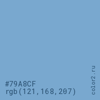Цвет #79A8CF в цветовой модели RGB обозначается тремя октетами (121, 168, 207) в десятичном формате и #79A8CF в шестнадцатиричном (hex) формате, которые являются интенсивностью красного 121 (hex 79), интенсивность зелёного 168 (hex A8) и интенсивность синего 207 (hex CF).