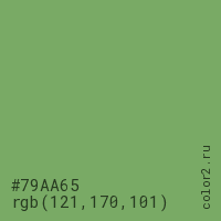 Цвет #79AA65 в цветовой модели RGB обозначается тремя октетами (121, 170, 101) в десятичном формате и #79AA65 в шестнадцатиричном (hex) формате, которые являются интенсивностью красного 121 (hex 79), интенсивность зелёного 170 (hex AA) и интенсивность синего 101 (hex 65).