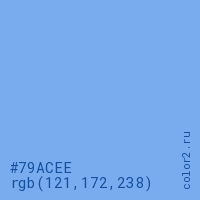 Цвет #79ACEE в цветовой модели RGB обозначается тремя октетами (121, 172, 238) в десятичном формате и #79ACEE в шестнадцатиричном (hex) формате, которые являются интенсивностью красного 121 (hex 79), интенсивность зелёного 172 (hex AC) и интенсивность синего 238 (hex EE).