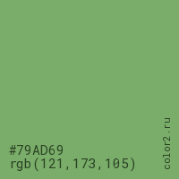 Цвет #79AD69 в цветовой модели RGB обозначается тремя октетами (121, 173, 105) в десятичном формате и #79AD69 в шестнадцатиричном (hex) формате, которые являются интенсивностью красного 121 (hex 79), интенсивность зелёного 173 (hex AD) и интенсивность синего 105 (hex 69).