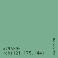 Цвет #79AF90 в цветовой модели RGB обозначается тремя октетами (121, 175, 144) в десятичном формате и #79AF90 в шестнадцатиричном (hex) формате, которые являются интенсивностью красного 121 (hex 79), интенсивность зелёного 175 (hex AF) и интенсивность синего 144 (hex 90).