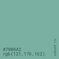 Цвет #79B0A2 в цветовой модели RGB обозначается тремя октетами (121, 176, 162) в десятичном формате и #79B0A2 в шестнадцатиричном (hex) формате, которые являются интенсивностью красного 121 (hex 79), интенсивность зелёного 176 (hex B0) и интенсивность синего 162 (hex A2).