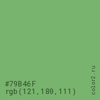 Цвет #79B46F в цветовой модели RGB обозначается тремя октетами (121, 180, 111) в десятичном формате и #79B46F в шестнадцатиричном (hex) формате, которые являются интенсивностью красного 121 (hex 79), интенсивность зелёного 180 (hex B4) и интенсивность синего 111 (hex 6F).