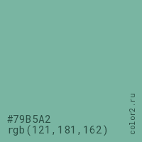 Цвет #79B5A2 в цветовой модели RGB обозначается тремя октетами (121, 181, 162) в десятичном формате и #79B5A2 в шестнадцатиричном (hex) формате, которые являются интенсивностью красного 121 (hex 79), интенсивность зелёного 181 (hex B5) и интенсивность синего 162 (hex A2).