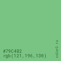 Цвет #79C482 в цветовой модели RGB обозначается тремя октетами (121, 196, 130) в десятичном формате и #79C482 в шестнадцатиричном (hex) формате, которые являются интенсивностью красного 121 (hex 79), интенсивность зелёного 196 (hex C4) и интенсивность синего 130 (hex 82).