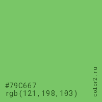 Цвет #79C667 в цветовой модели RGB обозначается тремя октетами (121, 198, 103) в десятичном формате и #79C667 в шестнадцатиричном (hex) формате, которые являются интенсивностью красного 121 (hex 79), интенсивность зелёного 198 (hex C6) и интенсивность синего 103 (hex 67).