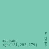 Цвет #79CAB3 в цветовой модели RGB обозначается тремя октетами (121, 202, 179) в десятичном формате и #79CAB3 в шестнадцатиричном (hex) формате, которые являются интенсивностью красного 121 (hex 79), интенсивность зелёного 202 (hex CA) и интенсивность синего 179 (hex B3).