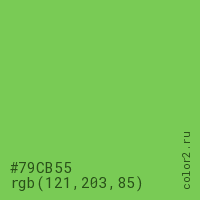 Цвет #79CB55 в цветовой модели RGB обозначается тремя октетами (121, 203, 85) в десятичном формате и #79CB55 в шестнадцатиричном (hex) формате, которые являются интенсивностью красного 121 (hex 79), интенсивность зелёного 203 (hex CB) и интенсивность синего 85 (hex 55).