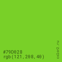 Цвет #79D028 в цветовой модели RGB обозначается тремя октетами (121, 208, 40) в десятичном формате и #79D028 в шестнадцатиричном (hex) формате, которые являются интенсивностью красного 121 (hex 79), интенсивность зелёного 208 (hex D0) и интенсивность синего 40 (hex 28).