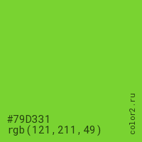 Цвет #79D331 в цветовой модели RGB обозначается тремя октетами (121, 211, 49) в десятичном формате и #79D331 в шестнадцатиричном (hex) формате, которые являются интенсивностью красного 121 (hex 79), интенсивность зелёного 211 (hex D3) и интенсивность синего 49 (hex 31).