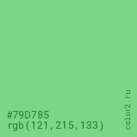 Цвет #79D785 в цветовой модели RGB обозначается тремя октетами (121, 215, 133) в десятичном формате и #79D785 в шестнадцатиричном (hex) формате, которые являются интенсивностью красного 121 (hex 79), интенсивность зелёного 215 (hex D7) и интенсивность синего 133 (hex 85).