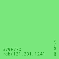 Цвет RGB(121, 231, 124) в процентом отношении количества цвета состоит из 47.5% красного (red), 90.6% зелёного (green) и 48.6% синего (blue).