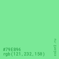 Цвет #79E896 в цветовой модели RGB обозначается тремя октетами (121, 232, 150) в десятичном формате и #79E896 в шестнадцатиричном (hex) формате, которые являются интенсивностью красного 121 (hex 79), интенсивность зелёного 232 (hex E8) и интенсивность синего 150 (hex 96).