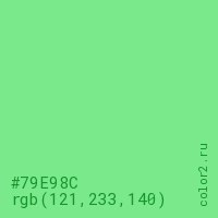 Цвет #79E98C в цветовой модели RGB обозначается тремя октетами (121, 233, 140) в десятичном формате и #79E98C в шестнадцатиричном (hex) формате, которые являются интенсивностью красного 121 (hex 79), интенсивность зелёного 233 (hex E9) и интенсивность синего 140 (hex 8C).