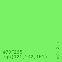 Цвет #79F265 в цветовой модели RGB обозначается тремя октетами (121, 242, 101) в десятичном формате и #79F265 в шестнадцатиричном (hex) формате, которые являются интенсивностью красного 121 (hex 79), интенсивность зелёного 242 (hex F2) и интенсивность синего 101 (hex 65).