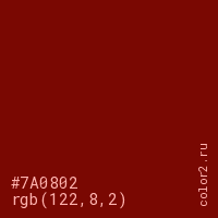 Цвет #7A0802 в цветовой модели RGB обозначается тремя октетами (122, 8, 2) в десятичном формате и #7A0802 в шестнадцатиричном (hex) формате, которые являются интенсивностью красного 122 (hex 7A), интенсивность зелёного 8 (hex 08) и интенсивность синего 2 (hex 02).