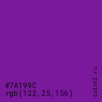 Цвет #7A199C в цветовой модели RGB обозначается тремя октетами (122, 25, 156) в десятичном формате и #7A199C в шестнадцатиричном (hex) формате, которые являются интенсивностью красного 122 (hex 7A), интенсивность зелёного 25 (hex 19) и интенсивность синего 156 (hex 9C).