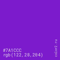 Цвет #7A1CCC в цветовой модели RGB обозначается тремя октетами (122, 28, 204) в десятичном формате и #7A1CCC в шестнадцатиричном (hex) формате, которые являются интенсивностью красного 122 (hex 7A), интенсивность зелёного 28 (hex 1C) и интенсивность синего 204 (hex CC).