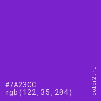 Цвет #7A23CC в цветовой модели RGB обозначается тремя октетами (122, 35, 204) в десятичном формате и #7A23CC в шестнадцатиричном (hex) формате, которые являются интенсивностью красного 122 (hex 7A), интенсивность зелёного 35 (hex 23) и интенсивность синего 204 (hex CC).