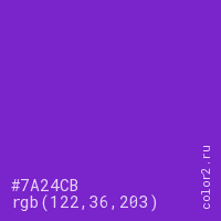 Цвет #7A24CB в цветовой модели RGB обозначается тремя октетами (122, 36, 203) в десятичном формате и #7A24CB в шестнадцатиричном (hex) формате, которые являются интенсивностью красного 122 (hex 7A), интенсивность зелёного 36 (hex 24) и интенсивность синего 203 (hex CB).