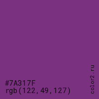 Цвет #7A317F в цветовой модели RGB обозначается тремя октетами (122, 49, 127) в десятичном формате и #7A317F в шестнадцатиричном (hex) формате, которые являются интенсивностью красного 122 (hex 7A), интенсивность зелёного 49 (hex 31) и интенсивность синего 127 (hex 7F).