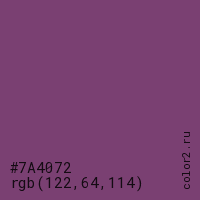 Цвет #7A4072 в цветовой модели RGB обозначается тремя октетами (122, 64, 114) в десятичном формате и #7A4072 в шестнадцатиричном (hex) формате, которые являются интенсивностью красного 122 (hex 7A), интенсивность зелёного 64 (hex 40) и интенсивность синего 114 (hex 72).