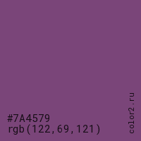 Цвет #7A4579 в цветовой модели RGB обозначается тремя октетами (122, 69, 121) в десятичном формате и #7A4579 в шестнадцатиричном (hex) формате, которые являются интенсивностью красного 122 (hex 7A), интенсивность зелёного 69 (hex 45) и интенсивность синего 121 (hex 79).