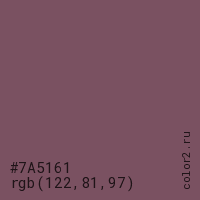 Цвет #7A5161 в цветовой модели RGB обозначается тремя октетами (122, 81, 97) в десятичном формате и #7A5161 в шестнадцатиричном (hex) формате, которые являются интенсивностью красного 122 (hex 7A), интенсивность зелёного 81 (hex 51) и интенсивность синего 97 (hex 61).