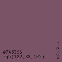 Цвет #7A5366 в цветовой модели RGB обозначается тремя октетами (122, 83, 102) в десятичном формате и #7A5366 в шестнадцатиричном (hex) формате, которые являются интенсивностью красного 122 (hex 7A), интенсивность зелёного 83 (hex 53) и интенсивность синего 102 (hex 66).