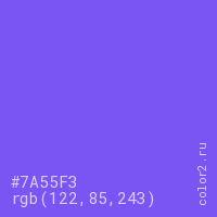 Цвет #7A55F3 в цветовой модели RGB обозначается тремя октетами (122, 85, 243) в десятичном формате и #7A55F3 в шестнадцатиричном (hex) формате, которые являются интенсивностью красного 122 (hex 7A), интенсивность зелёного 85 (hex 55) и интенсивность синего 243 (hex F3).