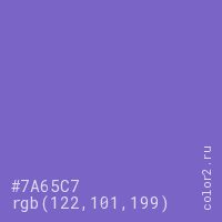 Цвет #7A65C7 в цветовой модели RGB обозначается тремя октетами (122, 101, 199) в десятичном формате и #7A65C7 в шестнадцатиричном (hex) формате, которые являются интенсивностью красного 122 (hex 7A), интенсивность зелёного 101 (hex 65) и интенсивность синего 199 (hex C7).