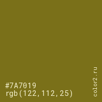 Цвет #7A7019 в цветовой модели RGB обозначается тремя октетами (122, 112, 25) в десятичном формате и #7A7019 в шестнадцатиричном (hex) формате, которые являются интенсивностью красного 122 (hex 7A), интенсивность зелёного 112 (hex 70) и интенсивность синего 25 (hex 19).