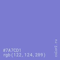 Цвет #7A7CD1 в цветовой модели RGB обозначается тремя октетами (122, 124, 209) в десятичном формате и #7A7CD1 в шестнадцатиричном (hex) формате, которые являются интенсивностью красного 122 (hex 7A), интенсивность зелёного 124 (hex 7C) и интенсивность синего 209 (hex D1).