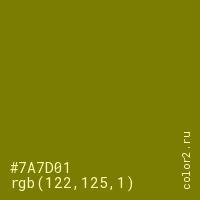 Цвет #7A7D01 в цветовой модели RGB обозначается тремя октетами (122, 125, 1) в десятичном формате и #7A7D01 в шестнадцатиричном (hex) формате, которые являются интенсивностью красного 122 (hex 7A), интенсивность зелёного 125 (hex 7D) и интенсивность синего 1 (hex 01).