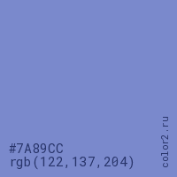 Цвет #7A89CC в цветовой модели RGB обозначается тремя октетами (122, 137, 204) в десятичном формате и #7A89CC в шестнадцатиричном (hex) формате, которые являются интенсивностью красного 122 (hex 7A), интенсивность зелёного 137 (hex 89) и интенсивность синего 204 (hex CC).